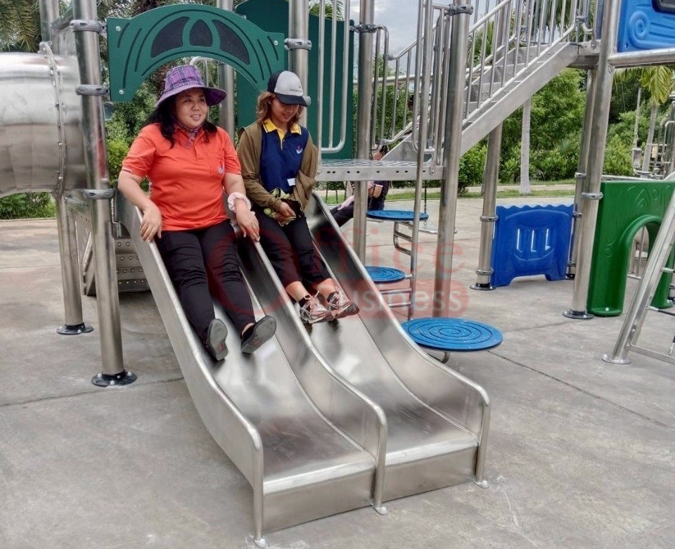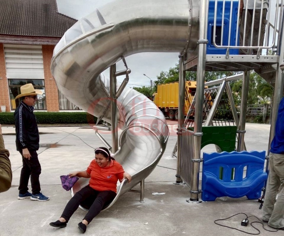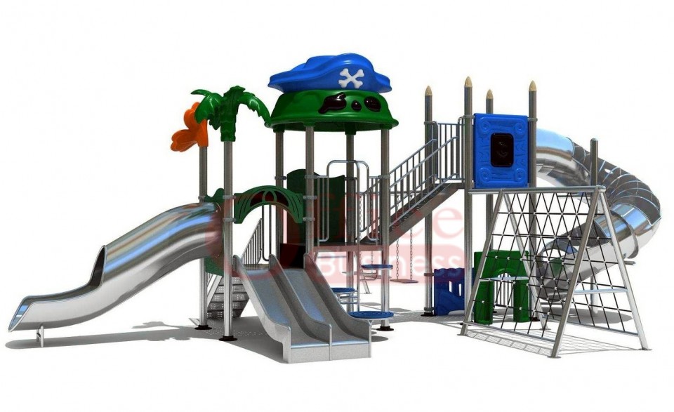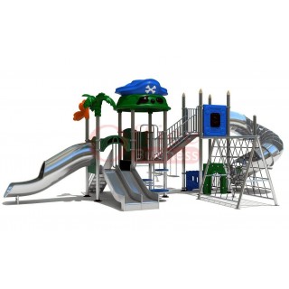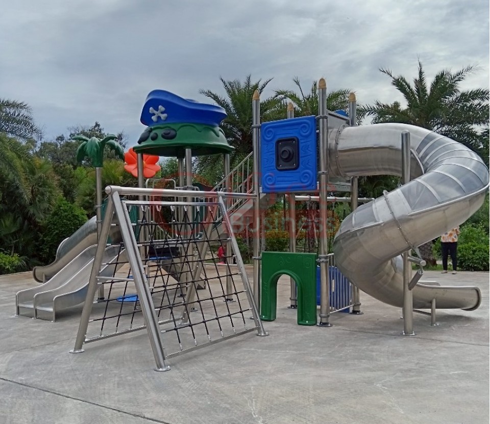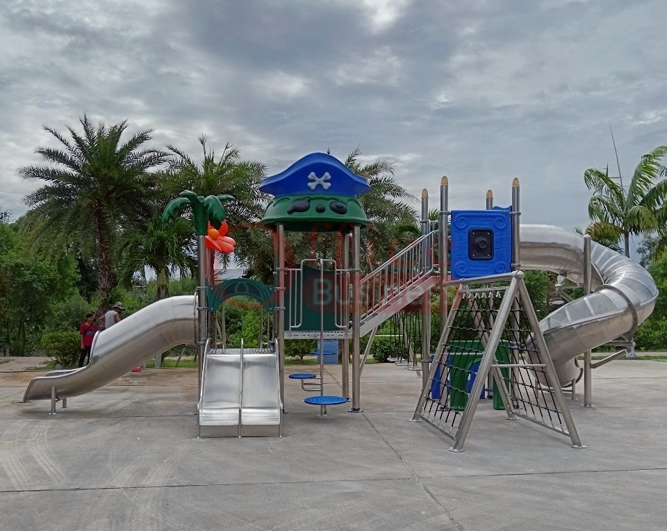 เครื่องสนามเด็กเล่นกลางแจ้งสแตนเลส ชุดหอผจญภัยพี่ฉลามกับน้องโลมา ขนาด 500 x 1100 x 450 ซม.